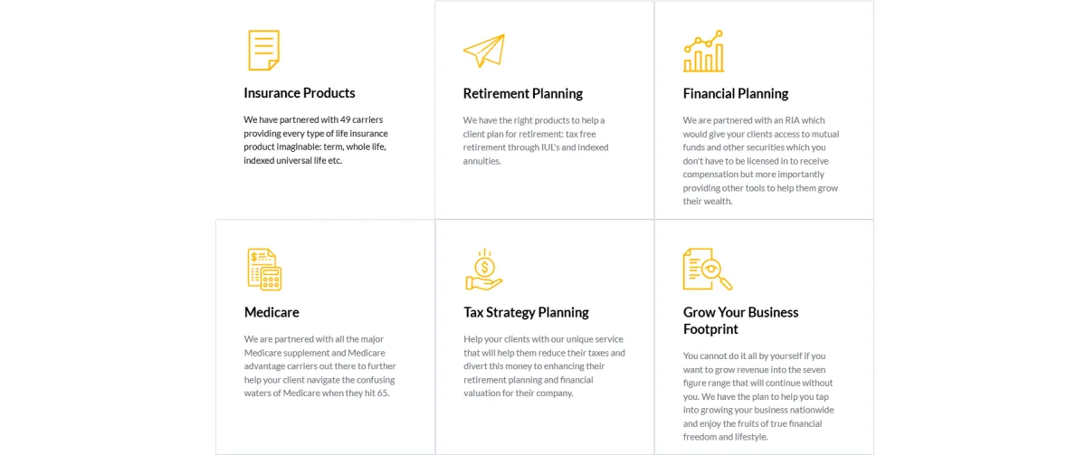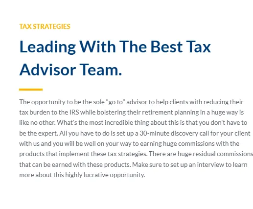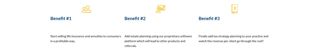 No other company, IMO, or agency has assembled the combination of products and services that will develop you from being a transactional life insurance agent just selling policies to survive to a trusted advisor that will help your client like no other agent can or ever has. You become their advisor for all their end of life needs and how to ensure all their assets are distributed to their beneficiaries, bypassing probate, in the manner they wish after they are gone. If they are a business owner, you will be the key reason for them to reduce their taxes by hundreds of thousands of dollars every year while diverting that money to enhancing their retirement situation leading to huge commission opportunities.No other company, IMO, or agency has assembled the combination of products and services that will develop you from being a transactional life insurance agent just selling policies to survive to a trusted advisor that will help your client like no other agent can or ever has. You become their advisor for all their end of life needs and how to ensure all their assets are distributed to their beneficiaries, bypassing probate, in the manner they wish after they are gone. If they are a business owner, you will be the key reason for them to reduce their taxes by hundreds of thousands of dollars every year while diverting that money to enhancing their retirement situation leading to huge commission opportunities.